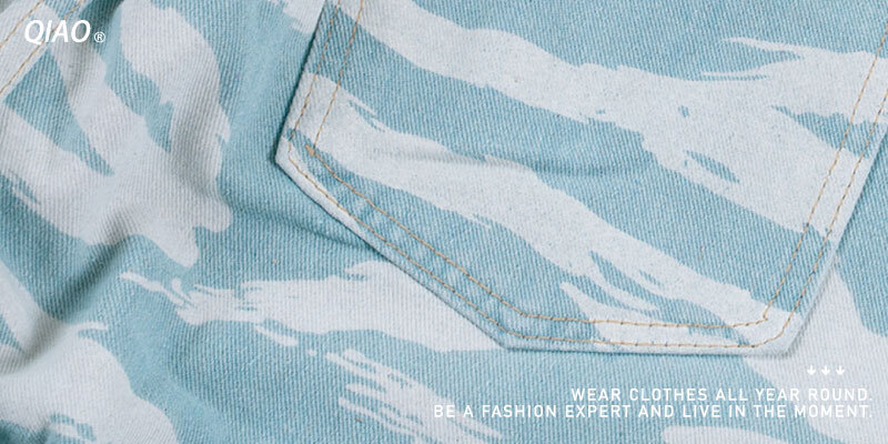 水洗迷彩風格,剪裁上採取了寬鬆的直筒設計,讓穿著感覺自在又帶點街頭氛圍。布料以淺藍色為基調,