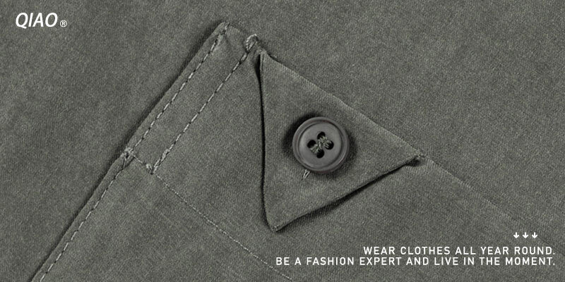 設計上特別強調 口袋車工細節,口袋以斜角加上鈕扣壓釦設計,不僅增添視覺層次感,也展現工裝感的精緻度。這樣的細節讓整體版型更有復古韻味。